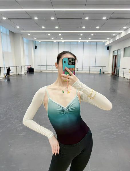 The leotard has great stretch and is double-lined (no worries about sweat marks!). I wore it to class and was very comfortable in it---the straps didn't dig at all and the legline didn't ride up. The colour placement on this is so flattering as the ombré gets darker around the waist and hips, so it has a slight slimming effect. It's stunning on its own, but also looks great with a black skirt or black leggings.